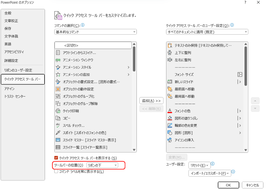 クイックアクセスツールバーの位置の設定