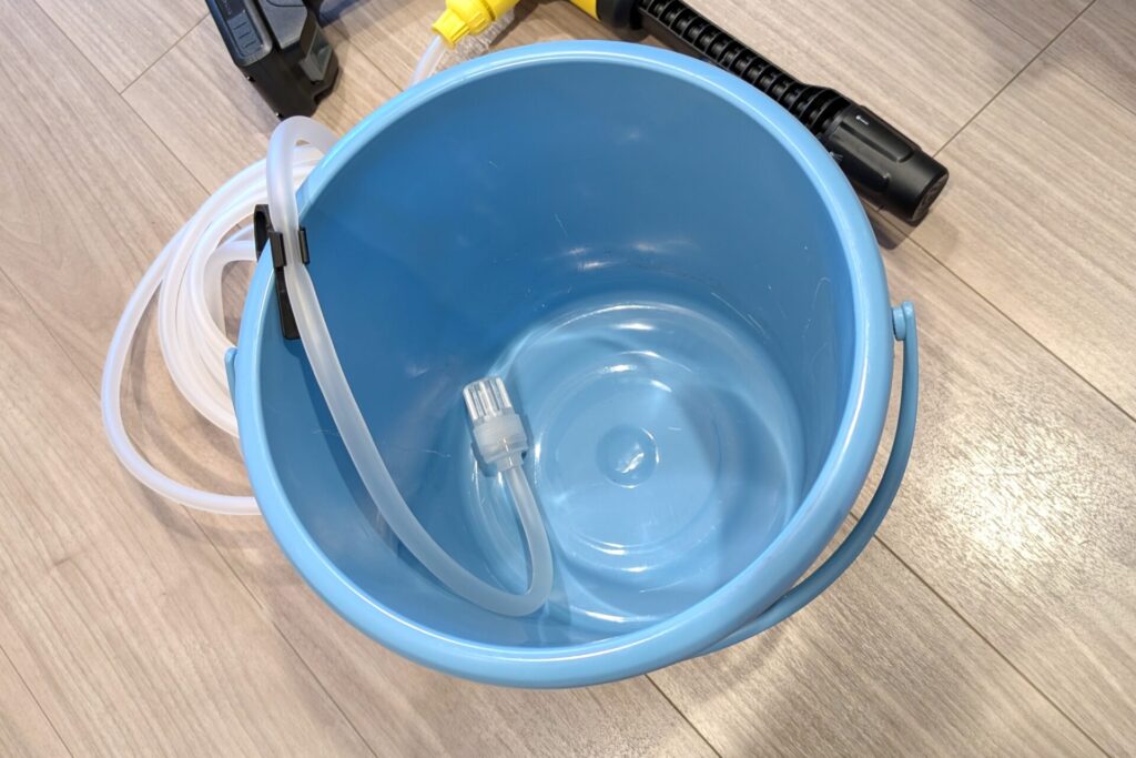 使い方は簡単で画像のように自吸用ホースを高圧洗浄機に接続し、水を吸い上げる方をバケツにクリップで固定するだけでよい。