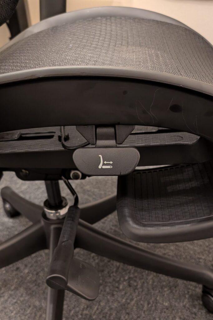 座面は前後に動かすことができ、自分の座りの深さに応じて調整ができる。