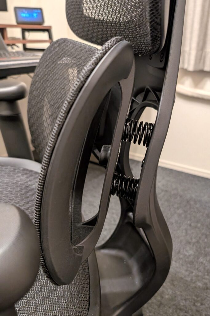 OC911の最大の特徴は圧倒的な腰のサポート感だ。腰の部分には左右で独立してフリーに動くランバーサポートがついている。このランバーサポートはガッシリとしたスプリングと接続されており、このスプリングのおかげで座る人の腰に合わせてランバーサポートが自由に動いて腰のフィット感を高めてくれる。