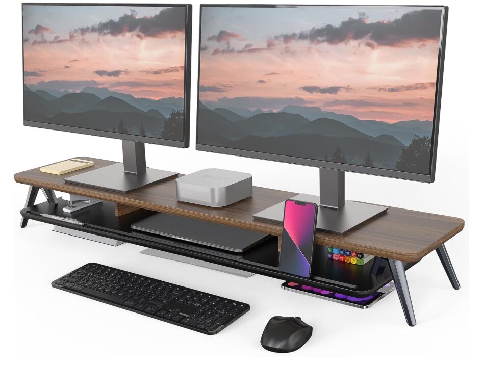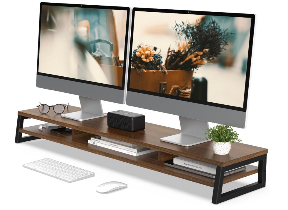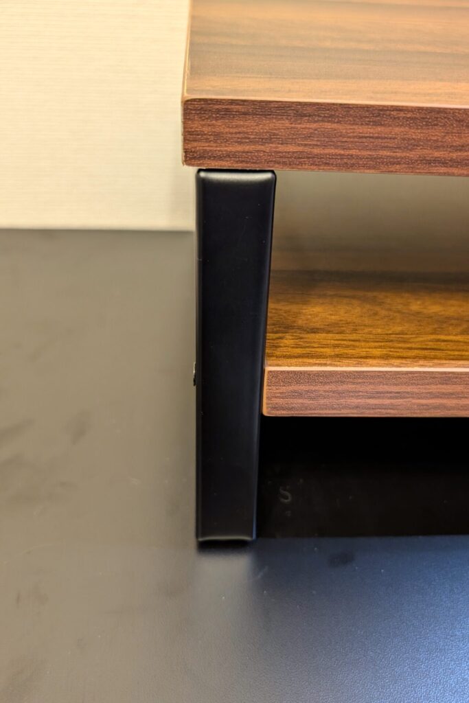 今回購入したのはFengeの幅108cm、2段のデスクシェルフだ。固有の製品名は見当たらないのでAmazonのリンクを確認してほしい。ウォールナット風のブラウンの板にブラックの金属製の脚がついており、おしゃれな雰囲気が気に入って購入した。