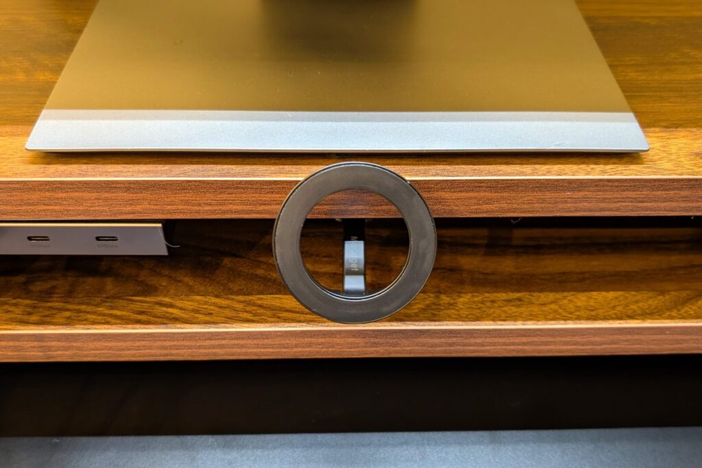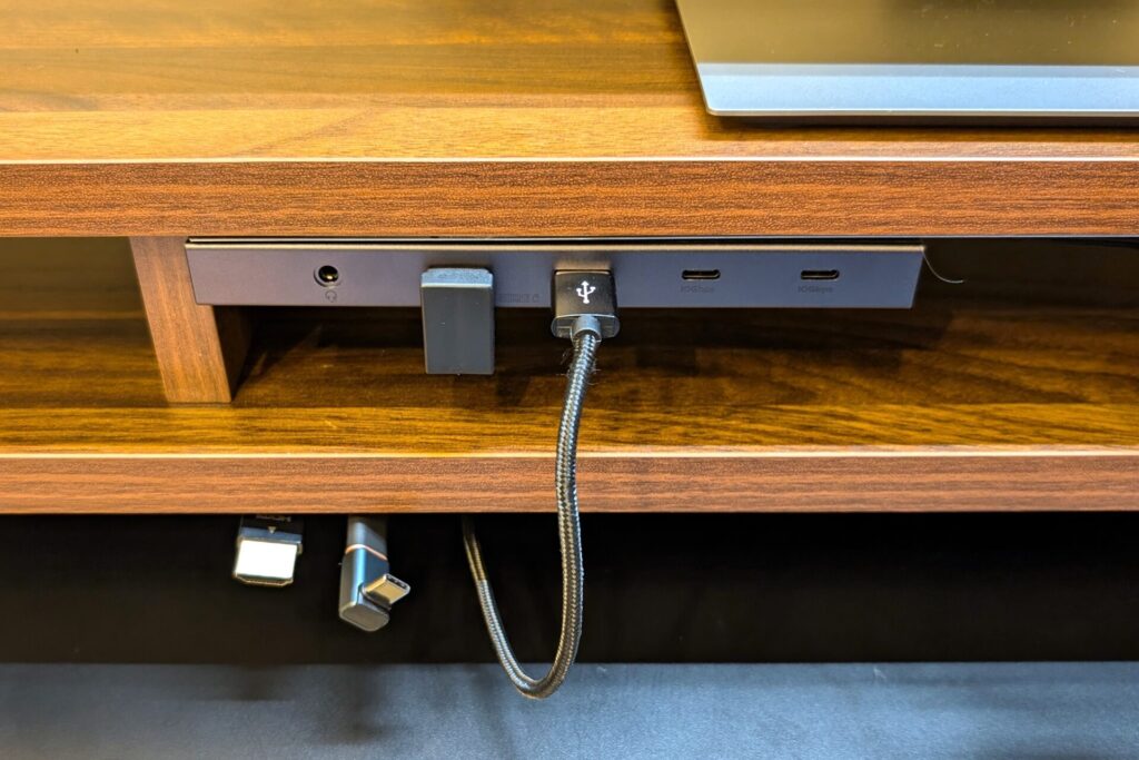 ドッキングステーションもデスクをゴチャつかせる要因の一つである。ドッキングステーションにはデスクの様々なデバイスのコードが集まってくるため、必然的にゴチャゴチャする。そのためできるだけ隠したいのだが、デスク上にないと端子にアクセスできなくなるため不便になってしまう。