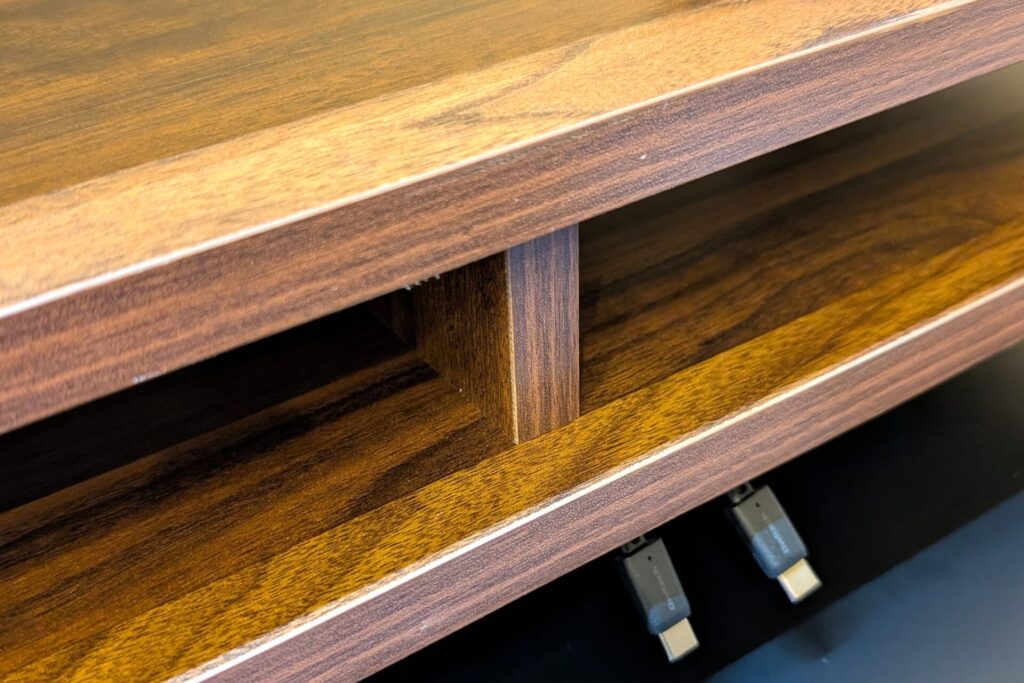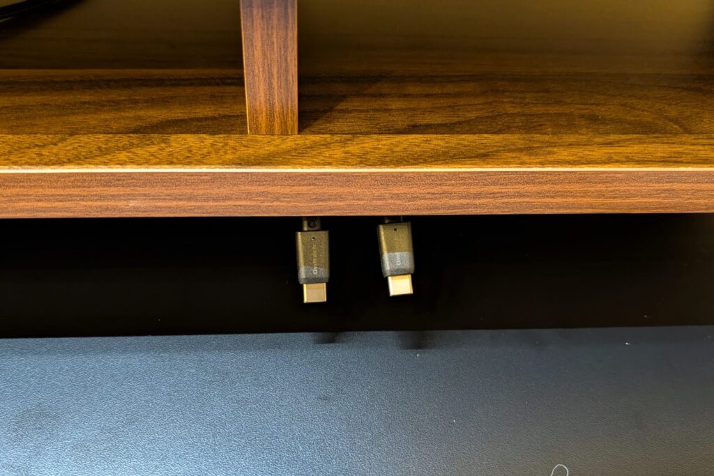 このジレンマにデスクシェルフはちょうどいい解決策となる。ゴチャゴチャなコード類はうまく隠しつつ、アクセスしたい端子を手前に出すことができる。俺は