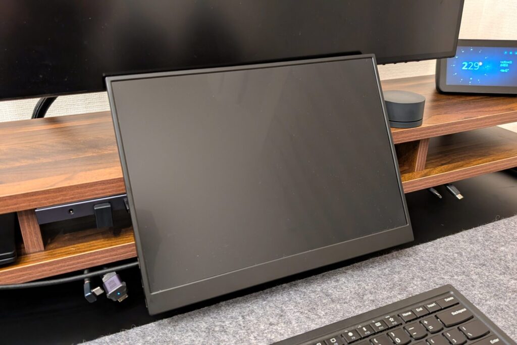 以上がメインモニターとなる27インチモニターの設置についてだ。そしてメインモニターの下には14インチのモバイルモニターを浮かせるように設置している。これは最近流行りのセットアップだが、浮かせることでウールフェルトマットをすっとデスクシェルフ下に収納することができるようになる。