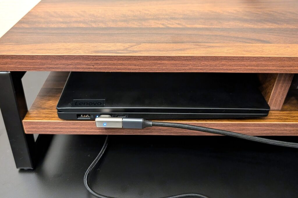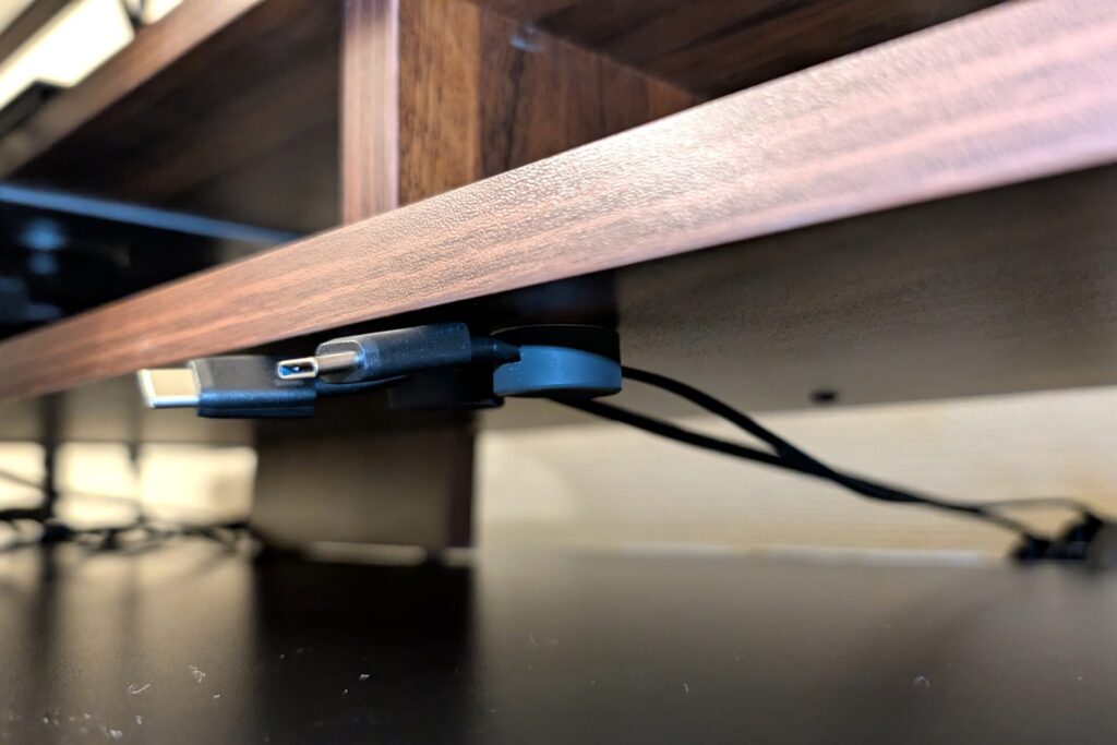 片巻きUSB-CケーブルをL字金具と両面テープなどでデスクに固定し、伸ばせるケーブル側を少し出してデスクシェルフ裏に忍ばせれば完成だ。