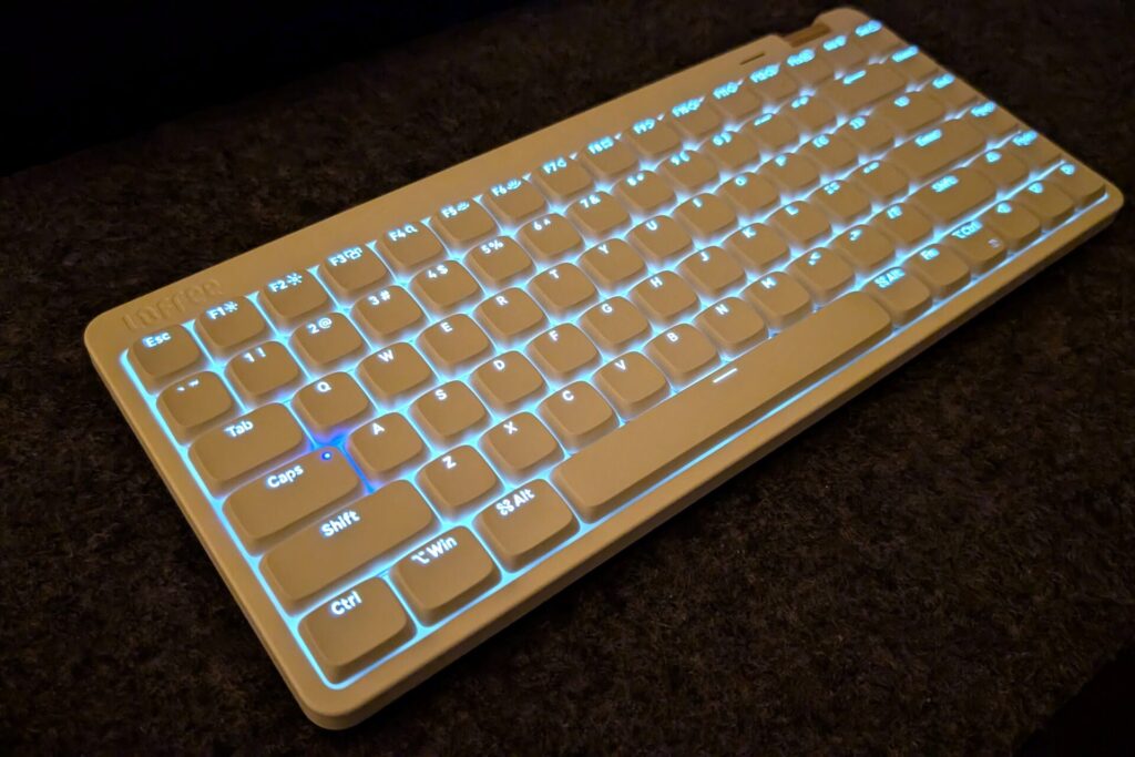 LOFREE Flow Lite 84には白のバックライトがついており、デフォルト設定では使用時に点灯するようになっている。この光も上品で非常に美しい。しばらくタイピングしていないとバックライトはオフになる。