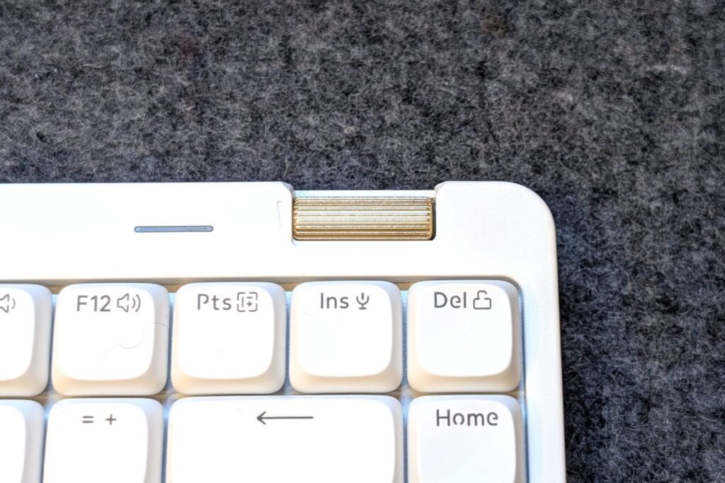 キーボード右上には金色のロータリーエンコーダがついており、これを回すと音量の調節ができる。Fn+F11,F12で調整できるから別にいらないだろうと思っていたが、意外と便利に使っている。ワンタッチで操作できるのは正義かもしれない。