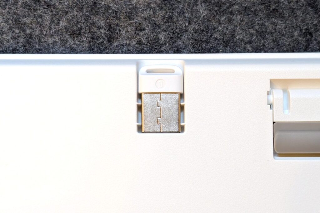 無線の場合はBluetooth接続とUSBドングルの2.4GHzレシーバーの2種類の方式を選べる。Bluetoothは最大3台まで登録可能で、Fn+1 ro 2 or 3で接続先を切り替えられる。無線での接続先の登録台数が多いのは仕事用・プライベート用両用で使いたい自分にとってはありがたい。
