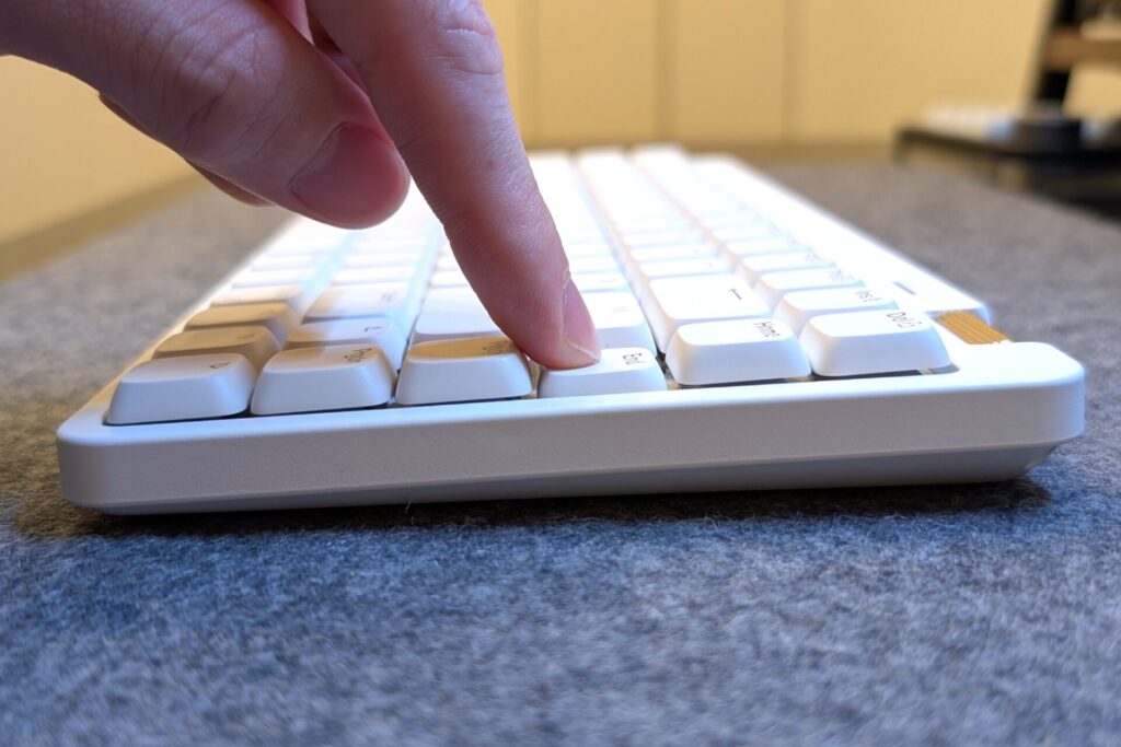 ノーマルプロファイルを検討した際に最大のハードルとなったキーストロークだが、LOFREE Flow Lite 84はロープロファイルなのでキーストロークは比較的浅い。それでもノートPCに使われているパンタグラフ式と比べると深いので使い始めてすぐはタイプミスが多かった。